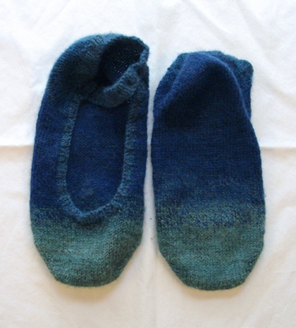 They say that you don’t really learn what your handspun yarn is like until you knit with it, and they’re right. This yarn was pretty in the skein, but a bit hard. Knit up, though, it softened and opened up even before the final wash. (I knit English style — with the yarn in the right hand — which opens up the twist a bit.) After a light blocking, by which I mean give the thing a bit of a soak and dry flat, they were soft and cozy and a bit fuzzy and everything I’d hoped they would be. The slight difference in each single made the colours flow nicely into each other, though I’d had to cut out a fair bit of the darker blue to get the light blue in. And just as I had imagined at the beginning, whenever I get frustrated or bored with something I’m spinning, I look down at my slippers and remember how rewarding the whole process will be.