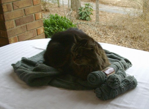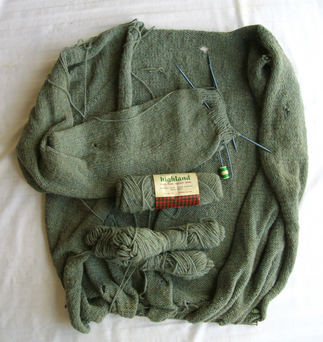 Since the last known knitter in himself’s family passed away over 20 years ago, this is one seriously aged unfinished object. Time has not been kind to it — note the dreaded moth holes — so it will remain unfinished, though it would have been most satisfying to complete the work of this obviously skilled knitter about whom I have heard so much, and wish I could have met. On the other hand, Chicken-leg Al tells me it’s fine just the way it is.