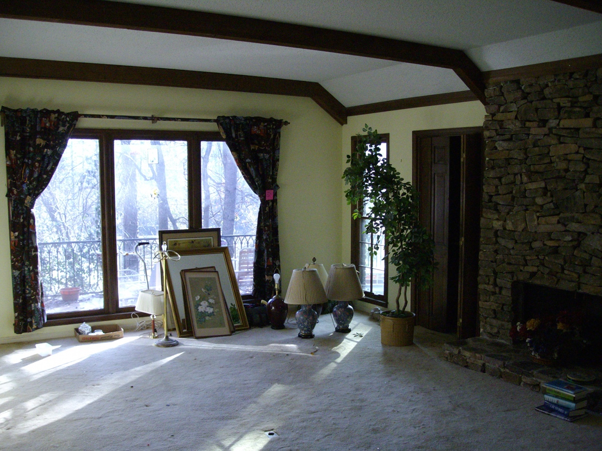 In its favour (apart from the light and the spaciousness, which both rooms have): it would be all mine; it has some built-in bookshelves; I really like the stone fireplace, even though I can’t actually light a fire in it; in the spring and summer, I can look out at all my potted plants.