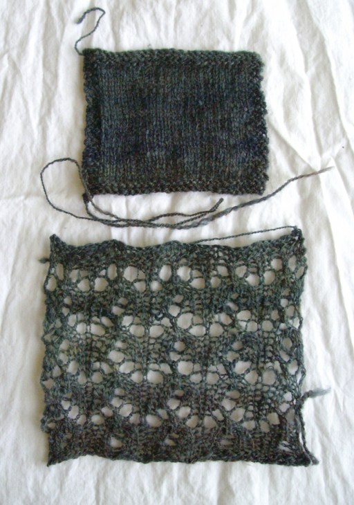 I set to work with the Cormo wool top above (Crown Mountain Farms, colourway From Dusk Till Dawn). If you’re going to play, play with something you like, and oh, do I like this fibre. Cormo is a finewool (17 to 23 microns), and spins up into a soft, springy yarn that you want next to your skin. (Unless of course you get carried away with your new high-speed flyer and put waaaaay too much twist in it. Which I may or may not have done with the first sample. I admit nothing.) This experiment was rather interesting. When I spun the Cormo for roughly a 2-ply sport/dk weight, it turned out like this: