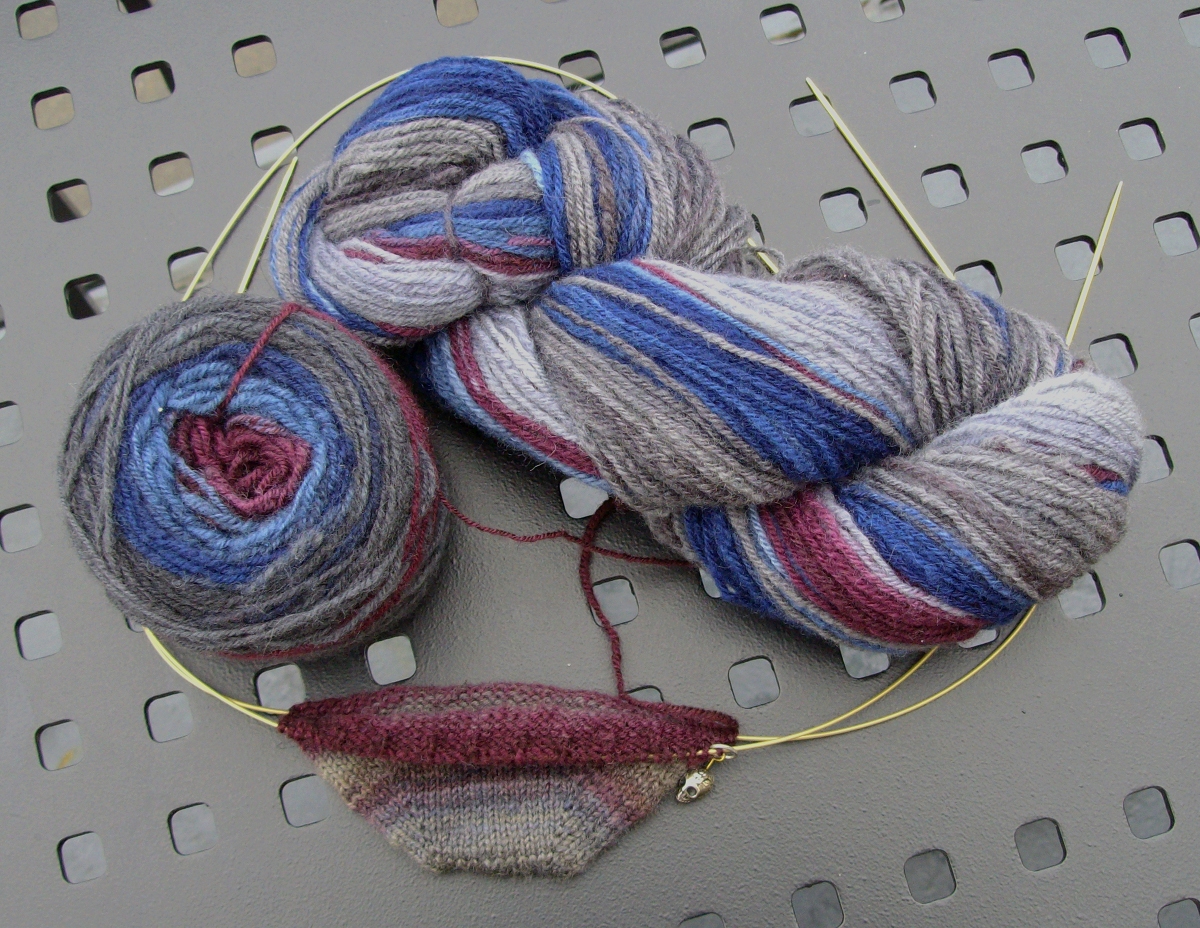 Now, this yarn ain’t perfect. One flaw inherent to n-plied yarn (especially as done by relative newbies like yours truly) is that since you’re plying one single back on itself, there’s little possibility of the evening-out that happens with regular plying: the thin bits end up plied with thin bits, and the thick bits with thick bits. In this case, they’d often be right next to each other, leading to a sudden change in thickness from one loop to the next (and it looked so even when I was spinning it, too. Gah.) The other thing is that n-plying is a pat-your-head/rub-your-belly kind of process when you’re starting out: get a rhythm established and as long as you don’t think about it too much, it goes pretty smoothly, but dare to think about what you’re doing, and suddenly your hands think they belong to somebody else, probably somebody really clumsy, while your feet keep treadling like they know what they’re about, and next thing you know you’ve way overtwisted that section. When this happened, I’d keep looping without treadling, letting the excess twist into the new loops until I ran out of arm length, then wind a bit on and repeat if necessary. I also tend to wind the plied yarn at a distance of several feet from my wheel, which hopefully allows for some flow of twist along the yarn, but still, there were a few wiry sections, my friends. And when your Polwarth is wiry, well, you’ve done something very wrong.