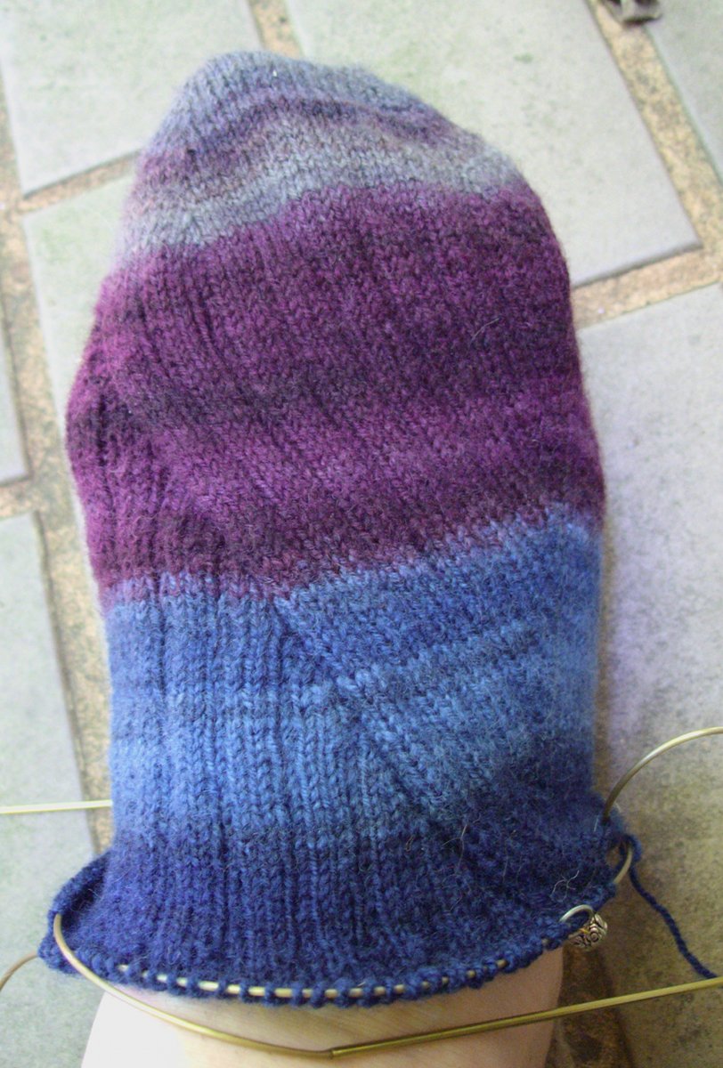 This yarn is relatively un-busy-looking, so I decided to play around with the 3×1 rib that is my standard sock stitch. I also made them a bit big, as they’re not superwash (and Polwarth is a felty fibre), so they’ll full a bit with wear. Here’s where we’re at so far: