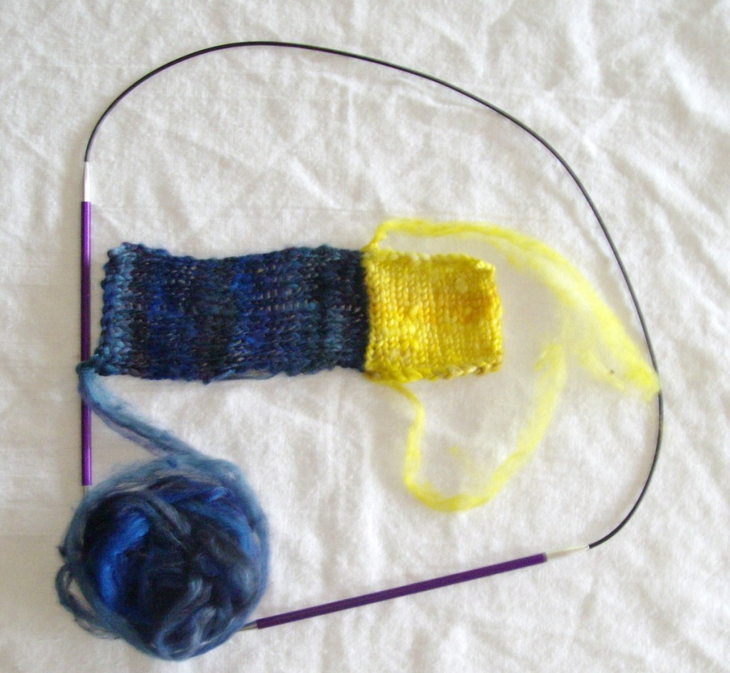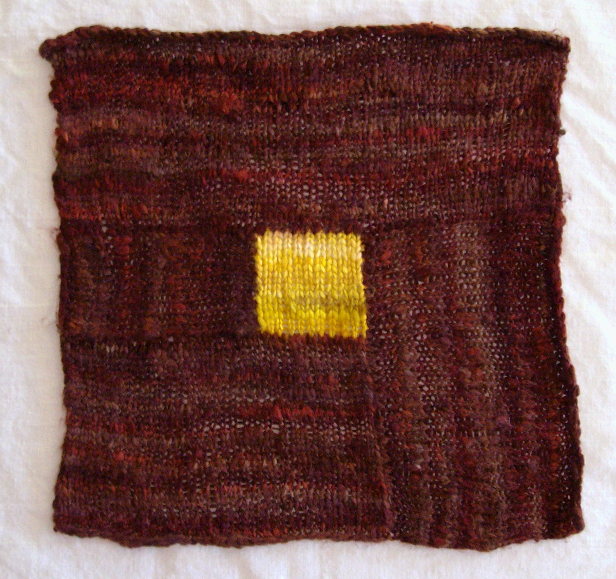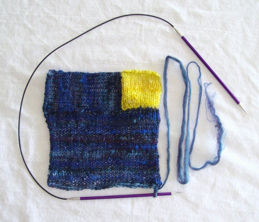 Being part 3 of a series of tutorials for the Mawata Colossus project. The first part explains how to knit with mawata or silk hankies, and the second gives a recipe for the Picture Window block. Because mawata don’t come in a standard yarn weight and you may have your own preferences for the gauge and size of your blocks, these posts describe how I make the blocks and give guidelines on making your own. They’re more sort of recipes, rather than proper tested, tech edited patterns.