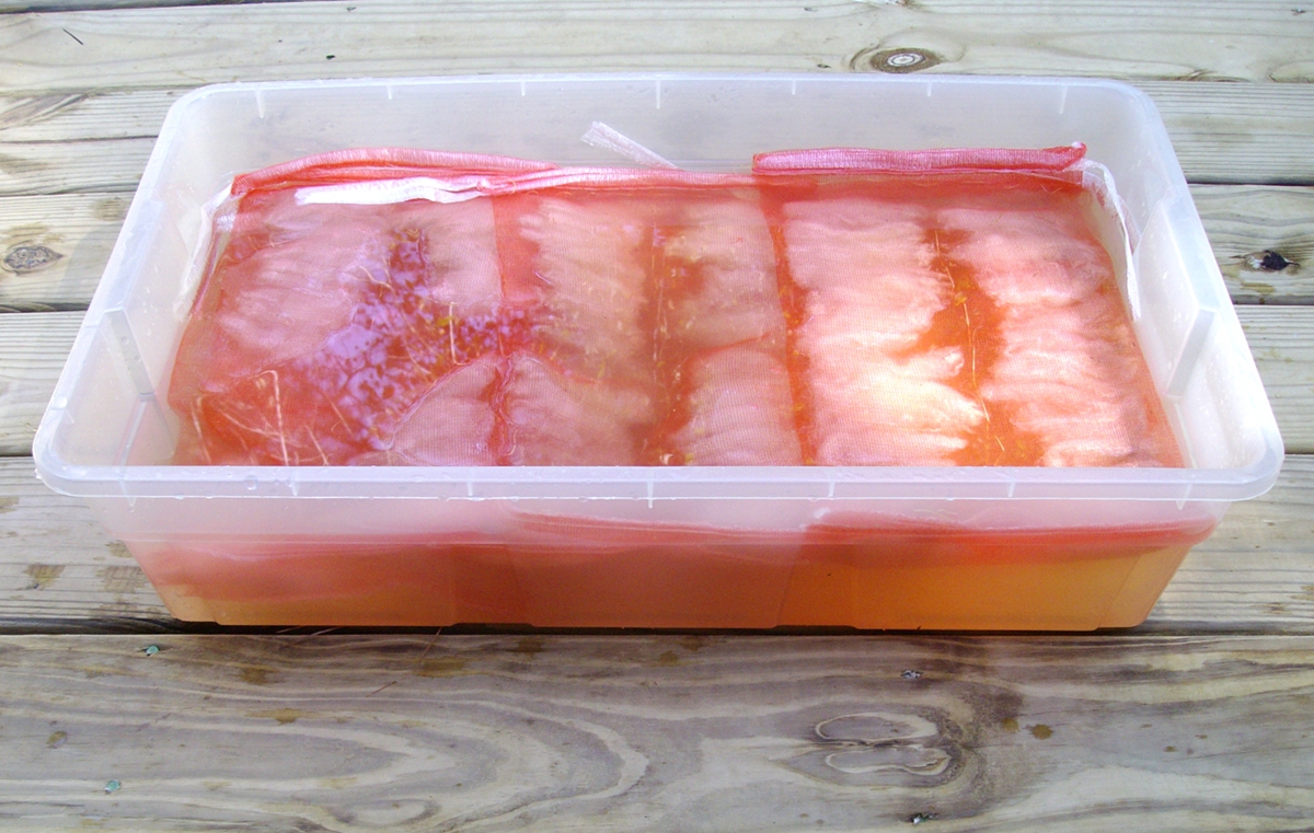 I carefully arranged some of them in some mesh produce bags, basted the bags shut so the wool wouldn’t move around, and scoured it: