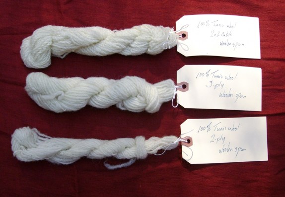 Sampling, sampling. The mini-skein at the top is my first cabled yarn, hence the slight wonkiness. I went with the 3-ply.