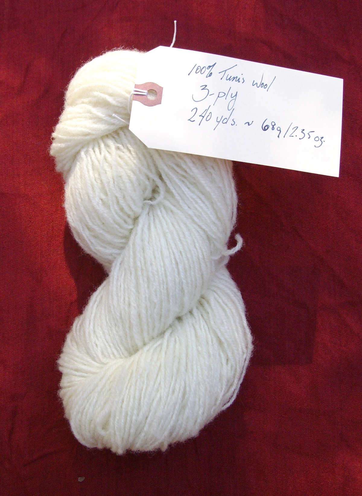 So far, there’s about 240 yards/220m of creamy, very sproingy 3-ply that’s not against-the-neck soft, but softer than I expected for the breed. Indeed, the yarn is so sproingy that I’m not entirely sure about the yardage, despite careful efforts not to stretch the yarn while re-skeining. And yes, spinning freshly prepared wool is definitely worth the work. It’s a whole ‘nother world, my friends, and I’m so hooked that I’m eyeing the stash of handpainted top with a mind to card it all. There should be enough Tunis to make one more skein like this, which will make some really cushy socks. I’m thinking indigo blue socks with cream toes and heels, and cream stripes on the cuffs. I mean, once you’re this deep into the process, you might as well start dyeing, right? Of course right.
