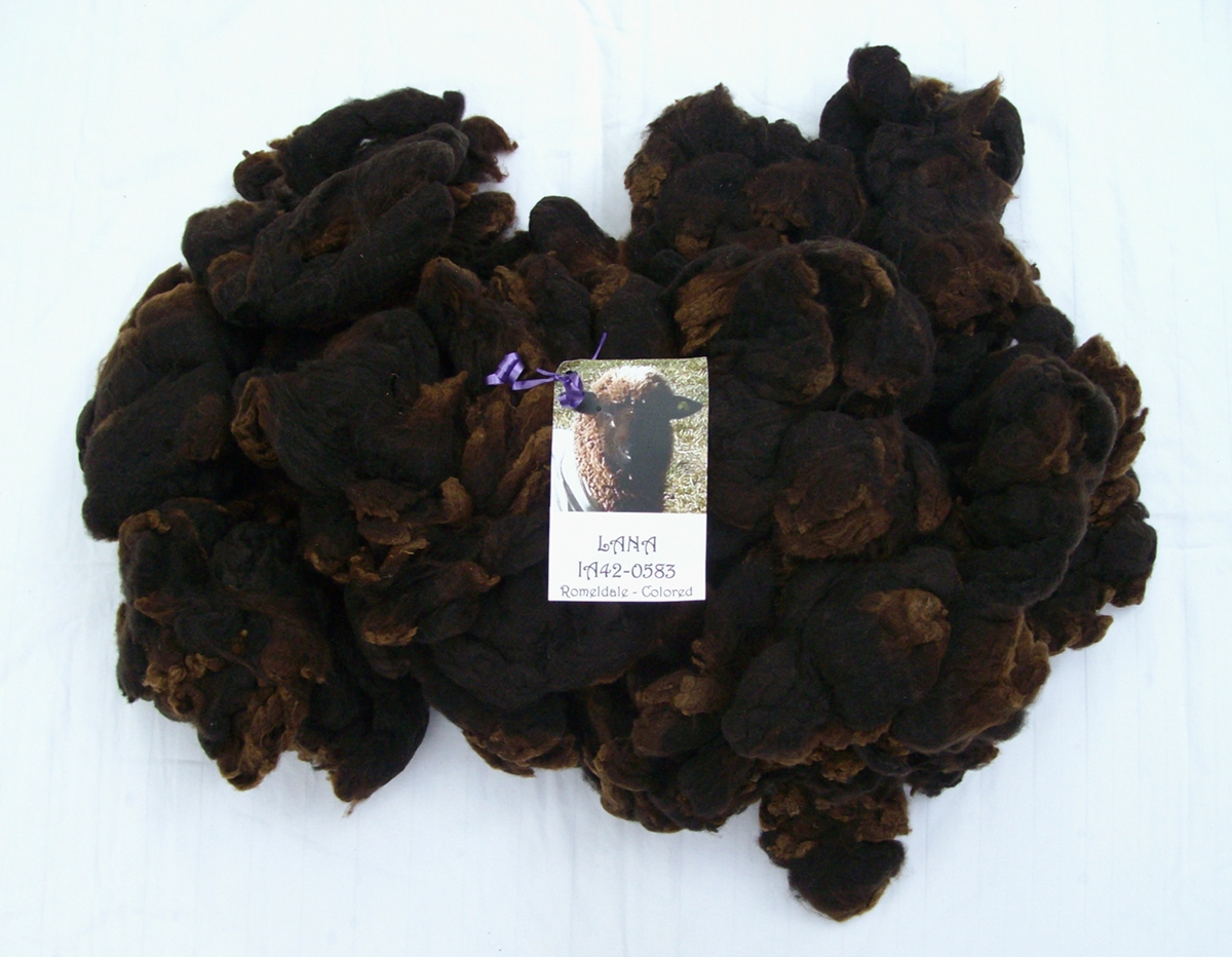 27.2 oz./772g washed California Variegated Mutant/Romeldale hogget fleece — the first and probably the softest fleece this sheep will produce — from Peeper Hollow Farm. It’s easily my favourite of the bunch: crimpy, velvety, just springy enough, and a deep, rich, chocolatey black. I’ve spun up some sample skeins in 2-ply and 3-ply, and strangely for me, I prefer the 2-ply.