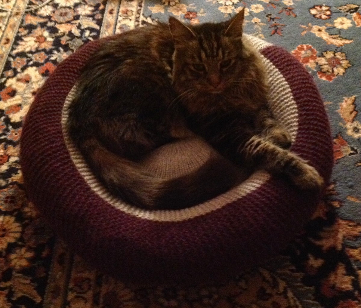 Then the seizures started. Snapping, drooling, howling things that swooped in out of nowhere and coursed through him in waves, scaring the everloving crap out of both of us. While we tried to figure out what was going on, and the vet kept extending the Maginot Line of anti-seizure medication, I did what my people do when we’re worried: we’re knitters, therefore we knit. This sick cat needed a bed. Not a spot on my bed; not the Princess-and-the-Pea-like stack of afghans on the couch; he needed his own bed. At least, I needed to make him one, and he would like it when it was done, and that was good enough for both of us.