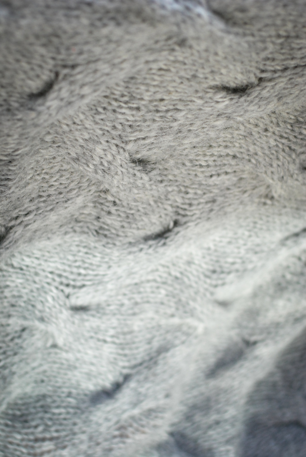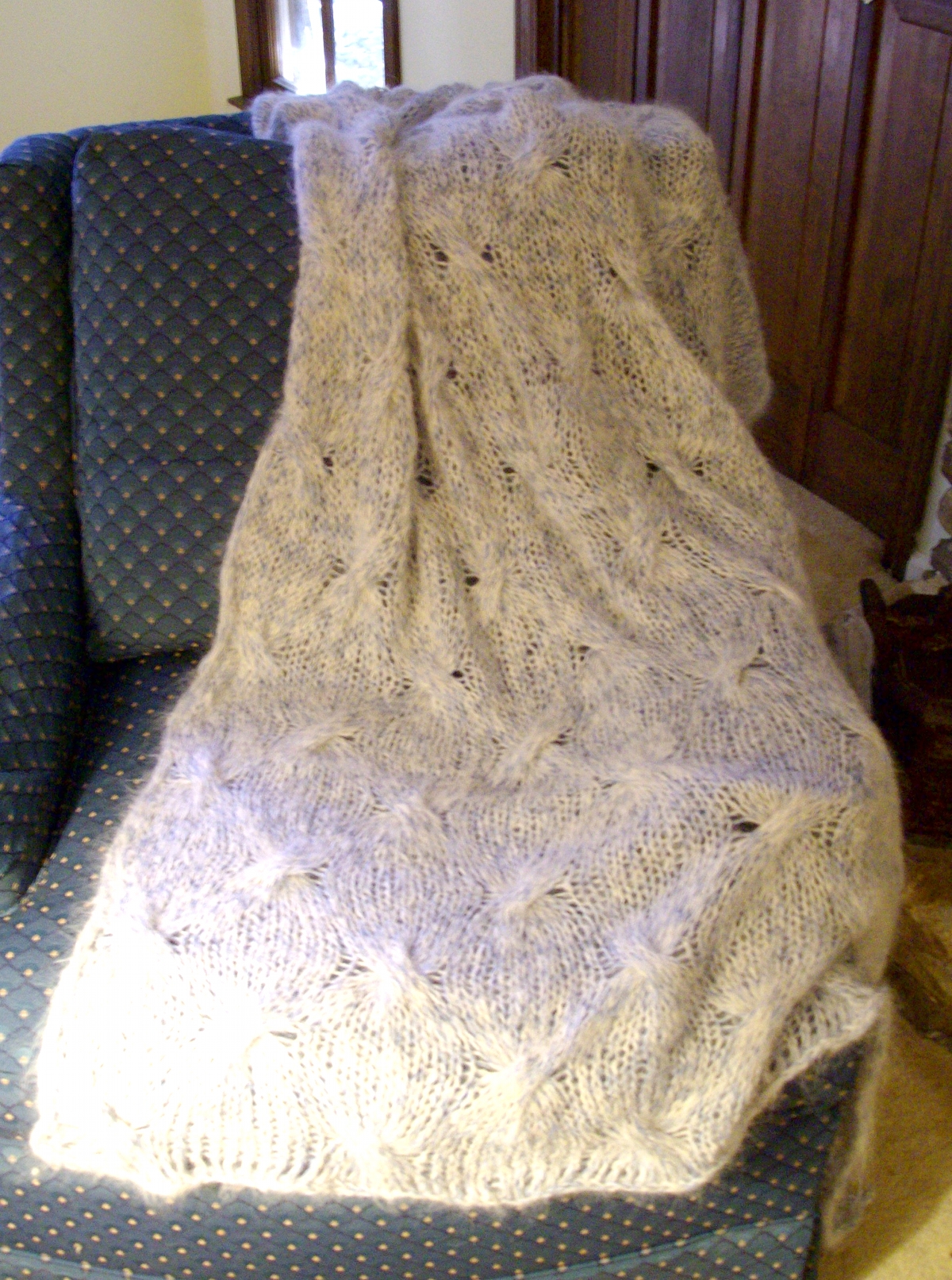 Some time ago, I designed a blanket as a wedding gift for my cousin. She lives in the frozen tundra of Edmonton, and I wanted the design to reflect that landscape. (Okay, it’s only frozen for half the year, but when it freezes, it doesn’t mess around.) I wanted something simple but elegant, in a neutral colour, that was lightweight (for shipping) but warm (because did I mention the winters up there?) I came up with an afghan in white Suri alpaca and blue alpaca/silk, with a broadly spaced cable pattern that looked like ripples in the snow.