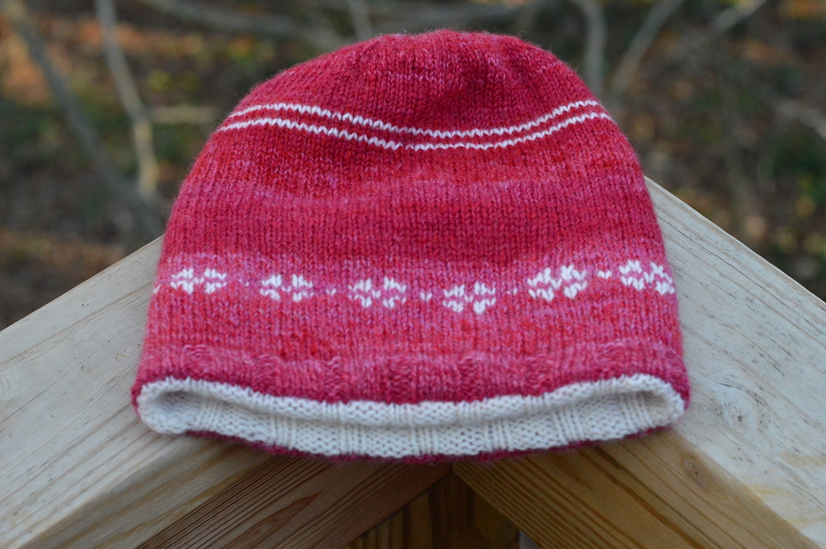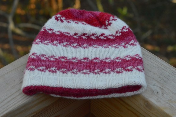Now, I may not be a big fan of pink, but The Ever-Growing Niece loves it. Loooooooves it. Pink, pink, pink, the brighter the better. I knew who this yarn was going to. It was a pretty fine yarn (roughly light sport weight), so I mixed it with some stash yarn (Sunday Knits Nirvana 3-ply in Cream), looked up some standard measurements, and made her a hat. Swatching? Who has time to swatch? It’s a hat, therefore it is its own swatch. Right?