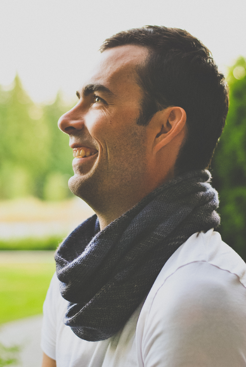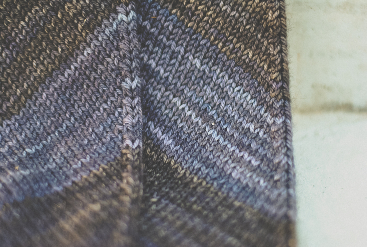 The yarn (some Tesseract that I’d bought from Astral Bath Yarns with this project in mind) is a merino/cashmere/silk blend, much drapier and more dense-feeling than the Spectra fingering weight of the original. I like the slight sheen the silk adds, and the addition of silk and cashmere make this version insanely soft and warm enough for even a Canadian winter. The contrast between the greys is quite subtle: working on the scarf in the evening, I had to hold the thing right under the lamp to see where the stripes were. The result is muted, more shadowy than stripey.