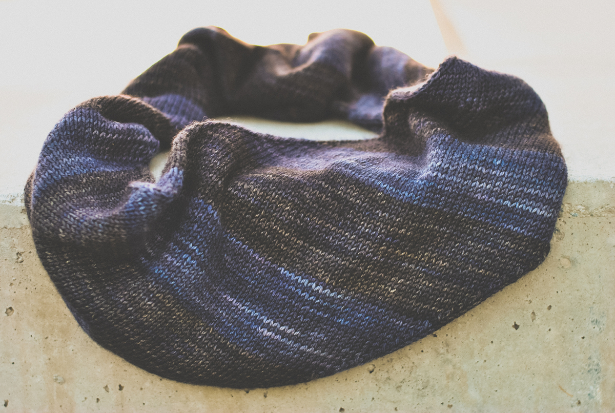 I think next time (and there will be a next time; this knitting is even more mindless than socks) I’ll make one in handspun, and block it so the stripes form chevrons.