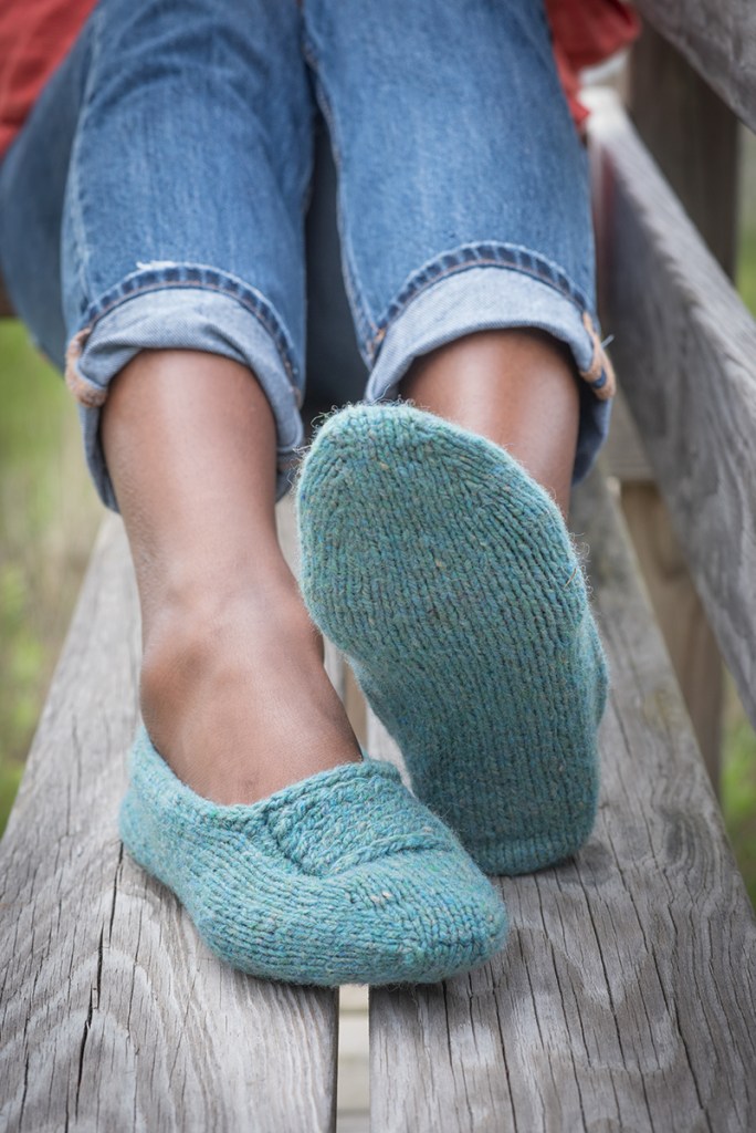 This is my usual cast on for toe up socks and slippers. I came across it years ago in Wendy D. Johnson’s book Toe Up Socks for Every Body, and it worked well for me, so I’ve stuck with it. I’m not going to tell you it’s the Best Cast On Ever, or even that it’s better or worse than any other toe up cast on out there, just that it works well for me and I kind of like the flippy motions of slinging the yarn around the needles like a very minimalist Cat’s Cradle. It’s the cast on I used in the Last Minute Travel Slippers, and I included this tutorial in the pattern. Here’s how you do it: