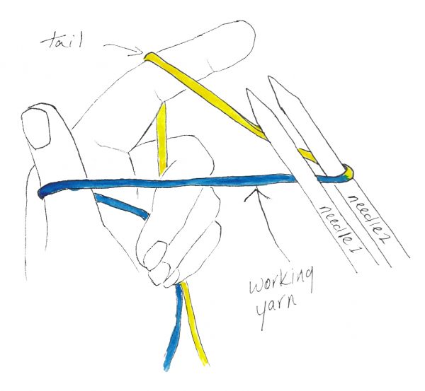 Take one tip from each of two circular needles. Hold the tips together, one (needle 1) below the other (needle 2). Arrange yarn so that the tail comes up over your index finger, over needle 2, between the needles, around your thumb from the outside, and from there over your palm to the ball of yarn. Use your other three fingers to hold the yarn ends firmly.
