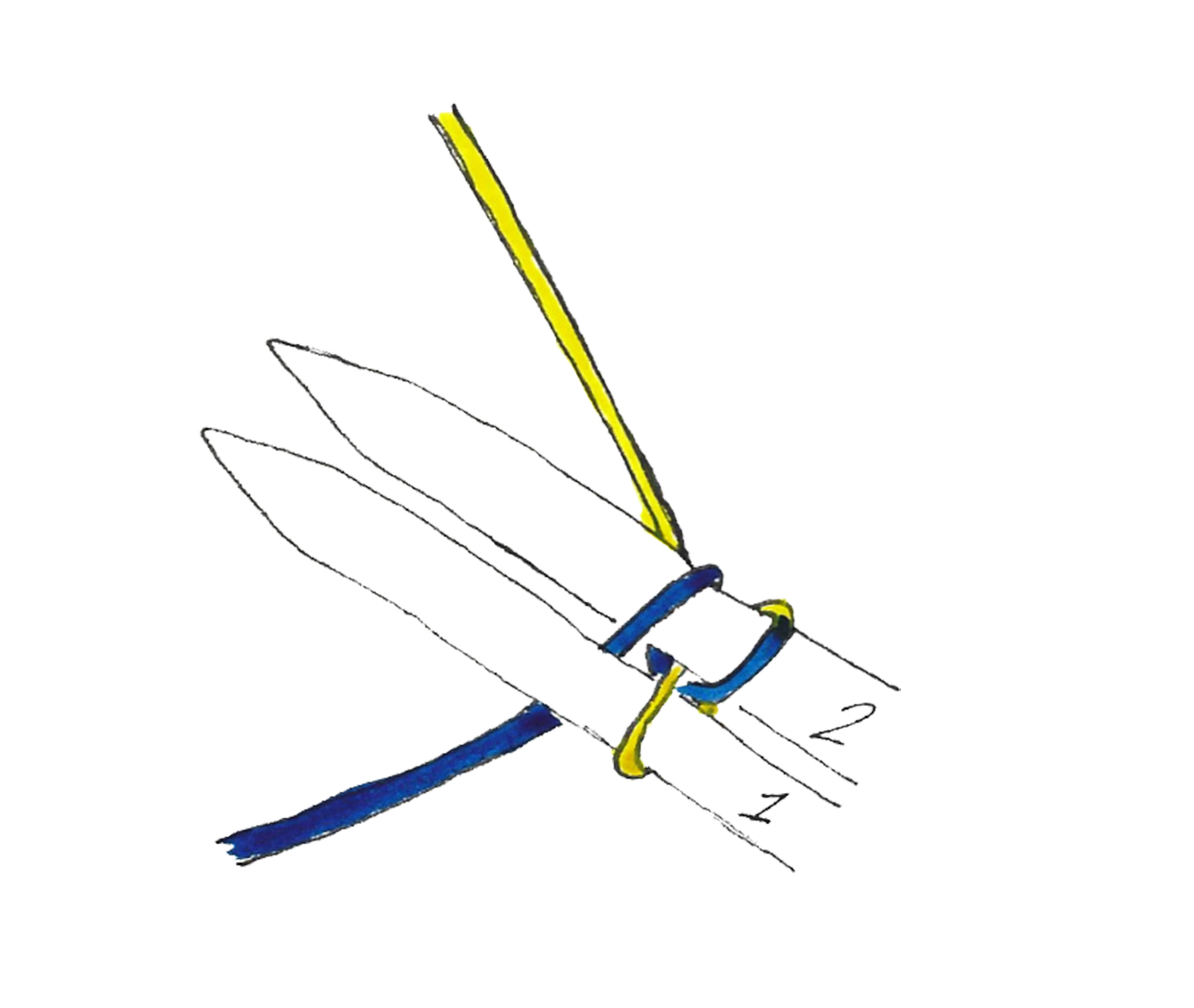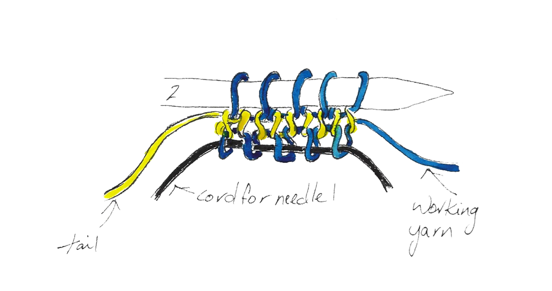 With your index finger, bring the tail behind needle 1, up around the front, and between the needles.