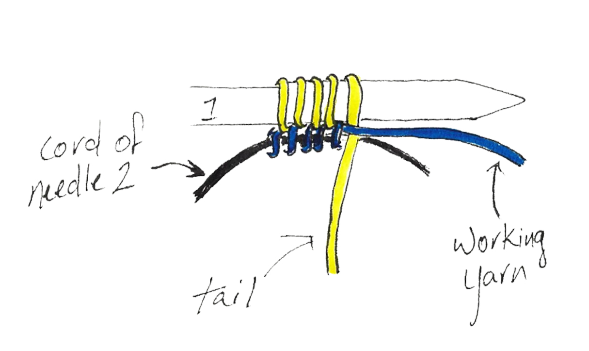 Turn needles over so that needle 1 is on the top and the tips are pointing to your right. Pull the tip of needle 2 to the right so that the bottom stitches are on the cord. Make sure the tail is between the working yarn and needle 1.