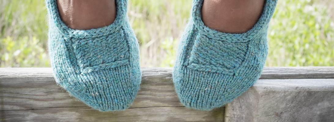 It started in May. I had a week to go before my road trip to Maryland Sheep & Wool, and the itch set in. The itch to make something for this trip. I can make something in a week, surely. It’s not like I have anything else to do. (I had a lot else to do.) I know: I’ll make some slippers! My beloved old moccasins are looking pretty beat up, and they take up a fair bit of room in the suitcase, and I bet I can whip out a pair of ballet-ish slippers that look nice and pack small and will keep my bare feet off the hotel carpet.