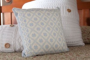 Stranded colourwork cushion cover with button side closure, based on traditional Swedish colourwork patterns. The cushion is worked in the round to the button band, then the band is worked flat in corrugated rib, and the other side is seamed.