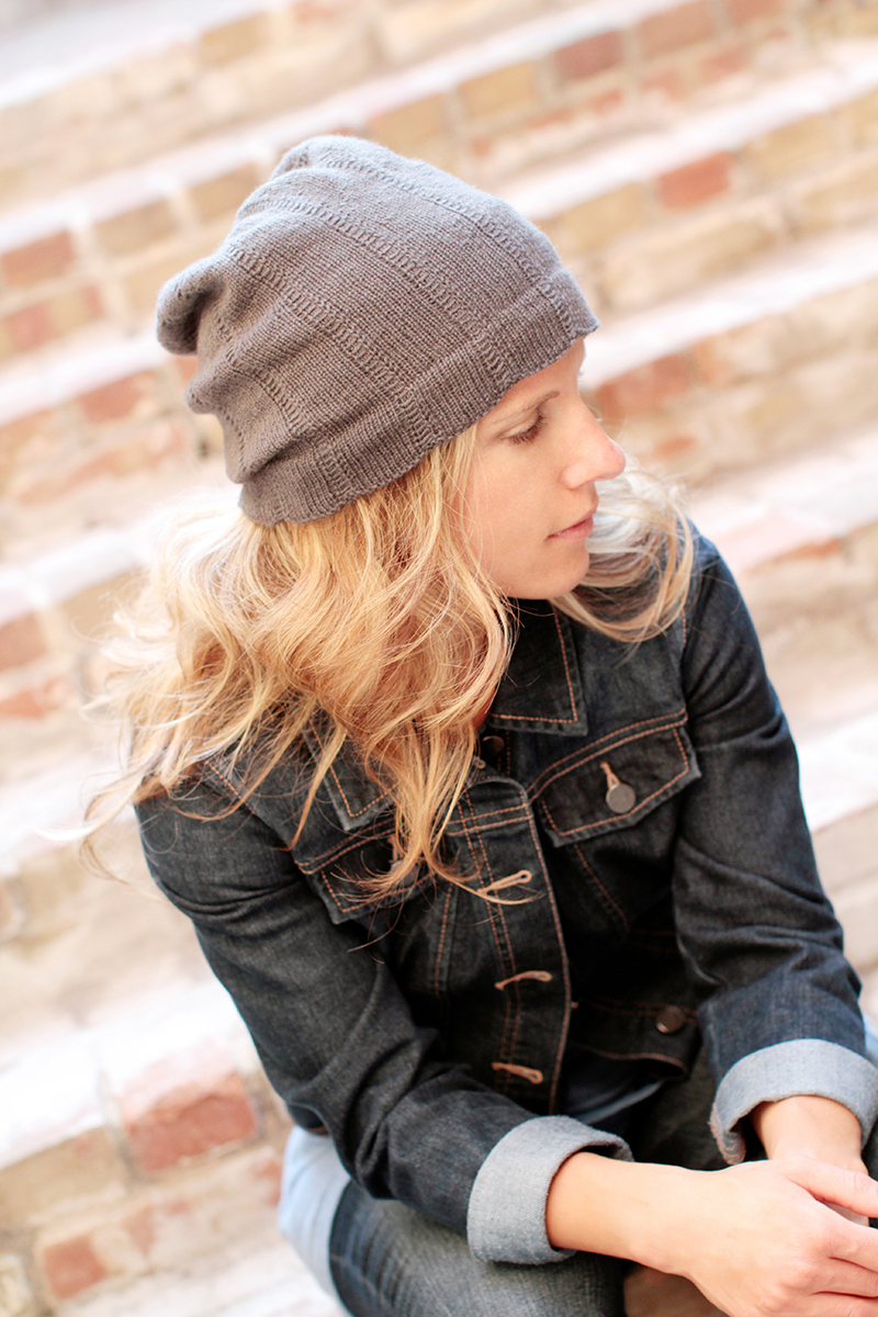 Knit up using one skein of June Cashmere lace, this stylish hat is worked in the round from brim to crown. A turned hem adds stability to the brim while short rows enhance the slouch, giving a light, warm, incredibly soft hat that fits in your pocket.