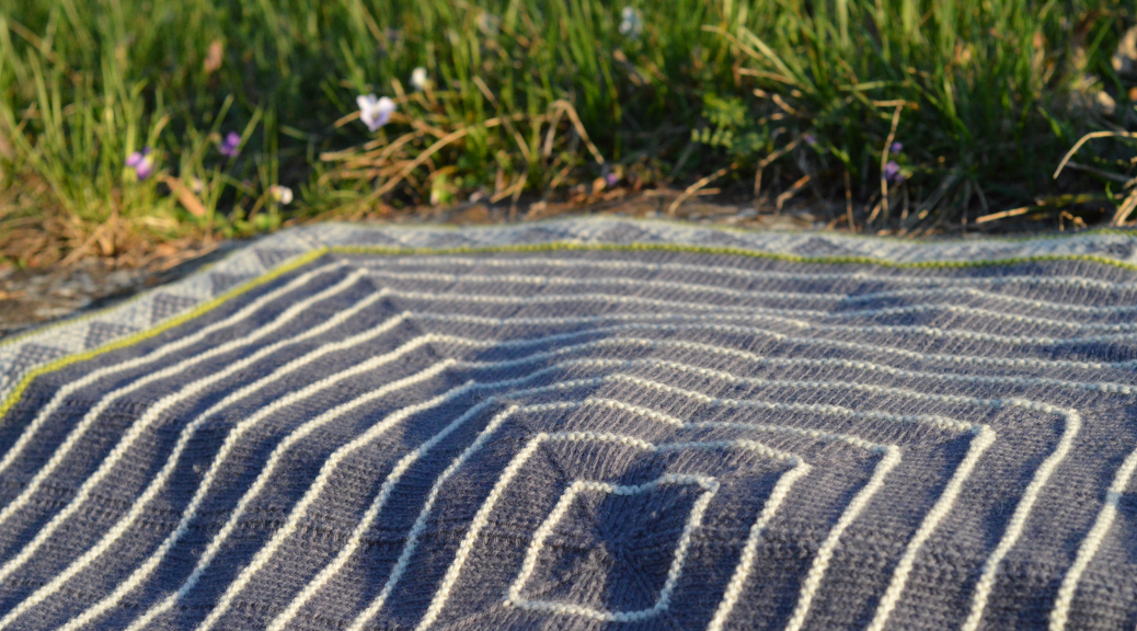 Brightsides is worked from the centre out with a slipped stitch texture and garter stitch stripes, ending in a garter mosaic stitch border. With mosaic stitch, you work with one colour at a time, slipping stitches in the other colour, so it’s an easy way to get a two-colour pattern without stranding. If you can knit, purl, and work in the round, you can make this blanket. All instructions are both charted and written, and include information about adjusting the blanket’s size (for instance, to make it as a shawl).