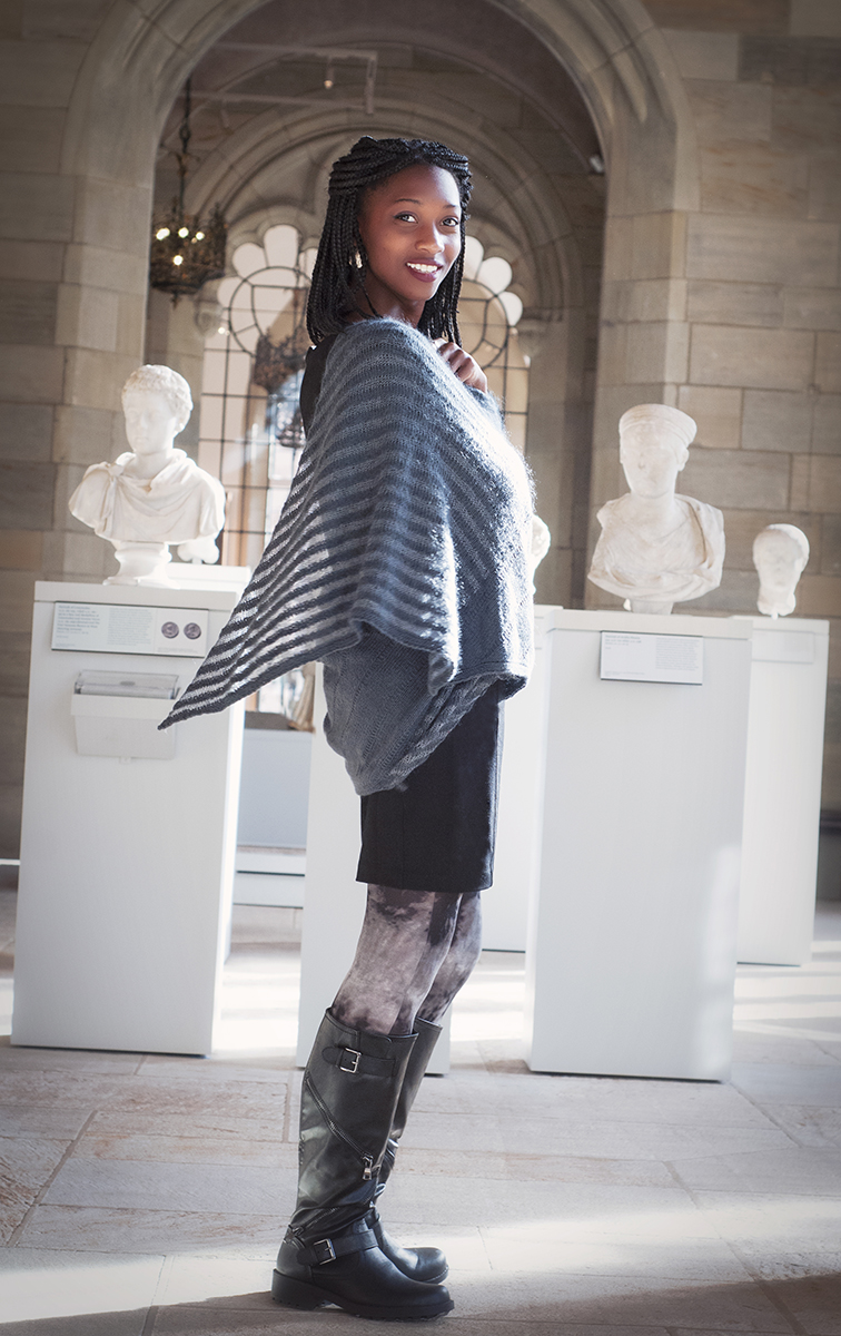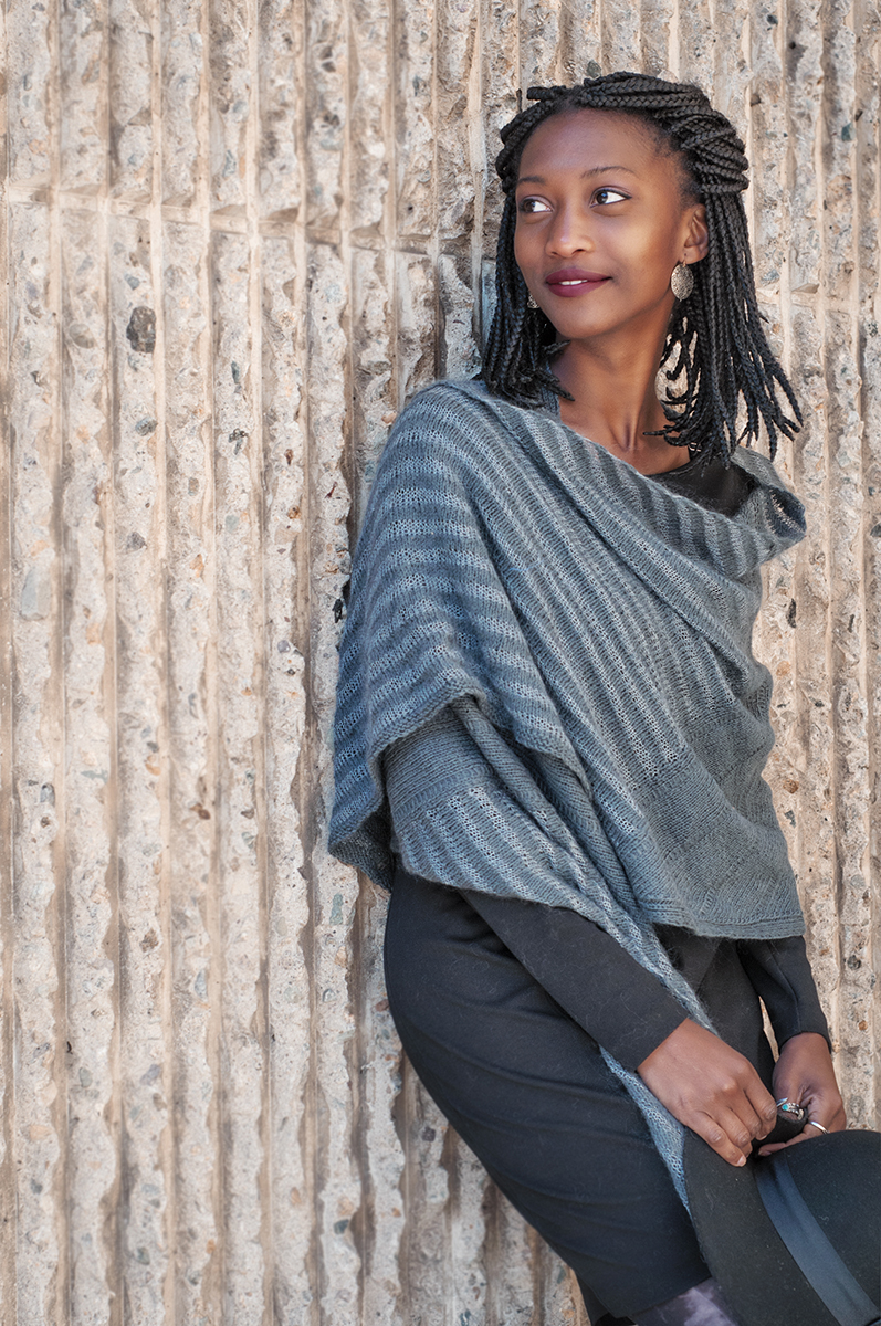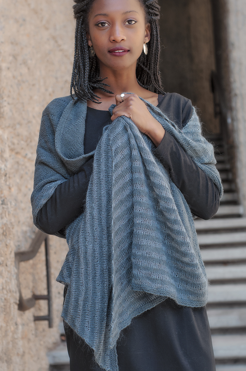 Slipped stitch columns and intarsia stripes take advantage of the geometry of bias knitting to create a striking, generous wrap. The intarsia stripes are not difficult to work, and the yarn is carried up the back, so there are few ends to weave in. Line and Shadow uses knit, purl, yarn over increases, decreases, and slipped stitches. The main yarn, Shibui Knits Cima laceweight, is held double throughout. The pattern instructions are written, not charted, and include tips for adjusting the size of the wrap.