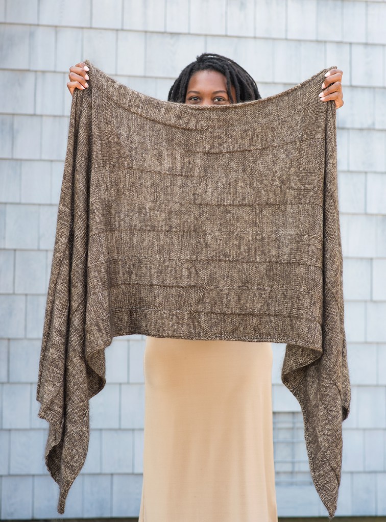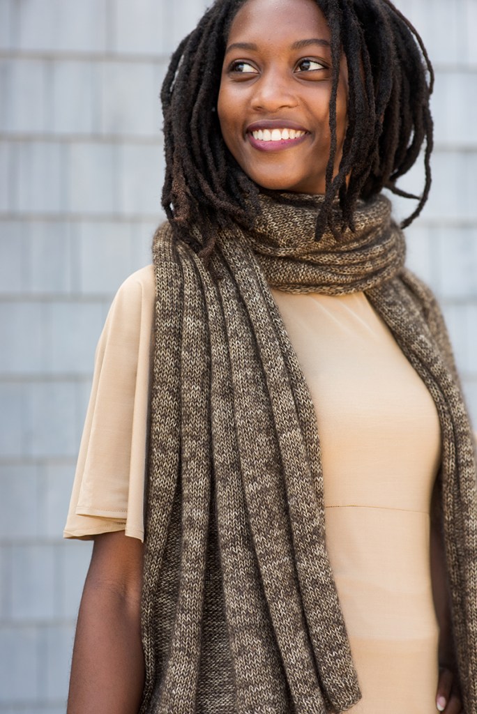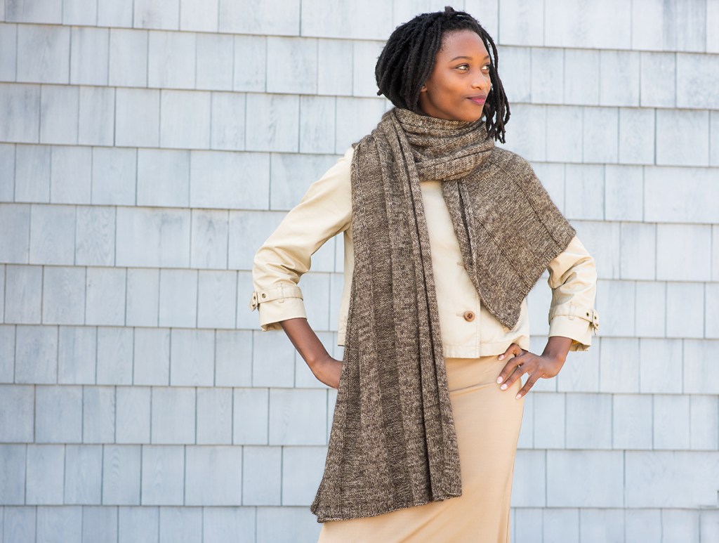 Drapey, cozy, elegantly simple: Rapport is comfort knitting with a dramatic result. The design is completely reversible and symmetrical, so it looks good however you wear it. The combination of Shibui Silk Cloud and Tosh Merino Light yields a fabric that is soft and warm, with a comforting weight and flickering colour. To make Rapport, you need to know how to knit, purl, and slip stitches. That’s it. The pattern includes instructions for three widths; the length is easily adjustable to suit your tastes. The sample shown is the largest size and is modeled by Josephine Ankarah, who is 5 ft 7 in/ 170cm tall.