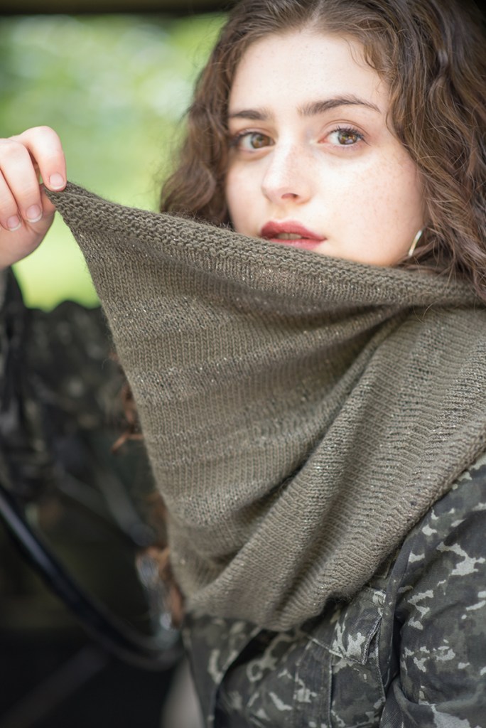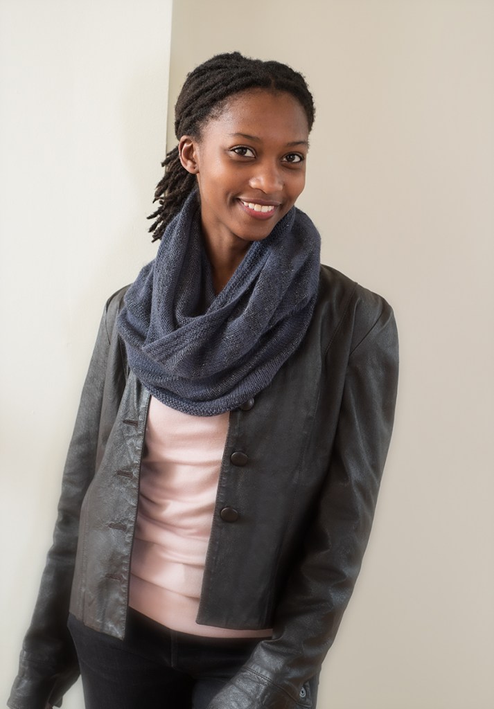 Monochrome stripes in different yarns give texture to this exquisitely soft, slouchy cowl. Short row wedges shape the cowl’s folds. The shorter size is a lovely, light cowl for crisp days, while the deeper size shown here gives more coverage, and can also be worn wrapped around the neck and pinned. Slouch Cowl is worked in the round from the bottom up, using knit and purl. The pattern includes an illustrated tutorial for German Short Rows.