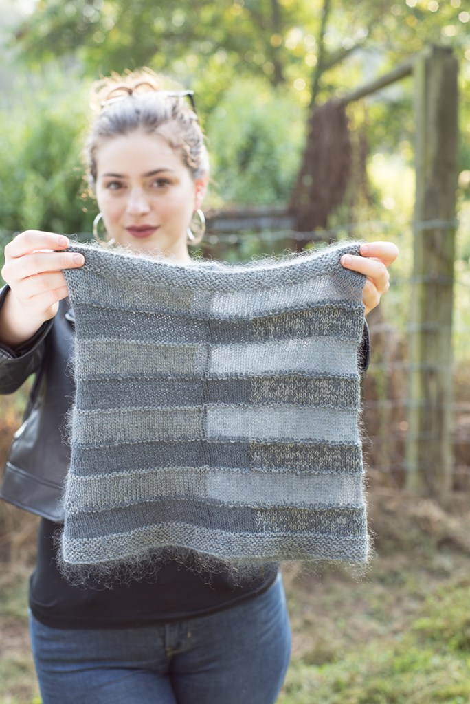 Stone Fences uses three different yarns in changing combinations to form interlocking stripes, with a look reminiscent of dry stone walls. Yarns are mixed and worked solo in the same row, giving an intarsia effect without the intarsia, while subtle shaping provides a nice fit. Stone Fences is worked flat and seamed at the back; pattern instructions are written only, and include instructions for adjusting the circumference.