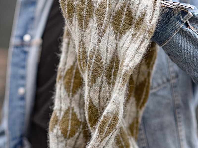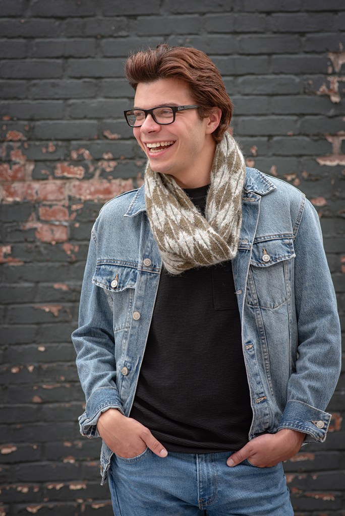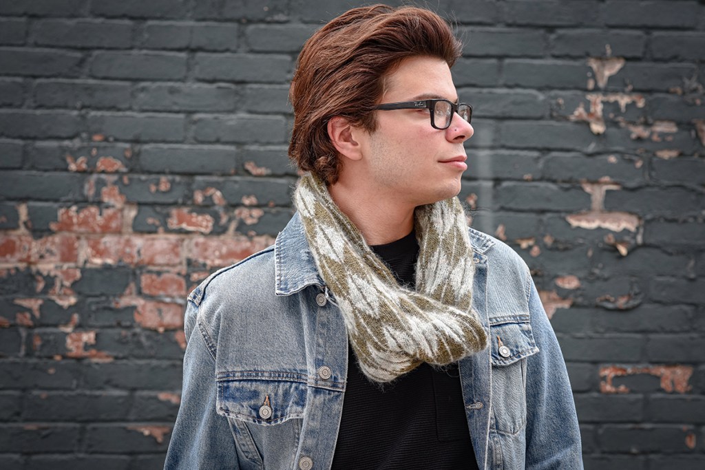 Waves of fluffy alpaca/silk and soft, rustically-spun Rambouillet, reminiscent of the strands of kelp that otters wrap themselves in to keep from drifting while they sleep. The Dreams of Otters pattern includes instructions for the regular single loop shown, a wider single loop, and a double loop, as well as an illustrated tutorial for the crocheted provisional cast on used in the sample. The Pattern Notes include information about the yarns used and tips for choosing substitutes. To make The Dreams of Otters, you will need to know how to do stranded colourwork in the round using charts.